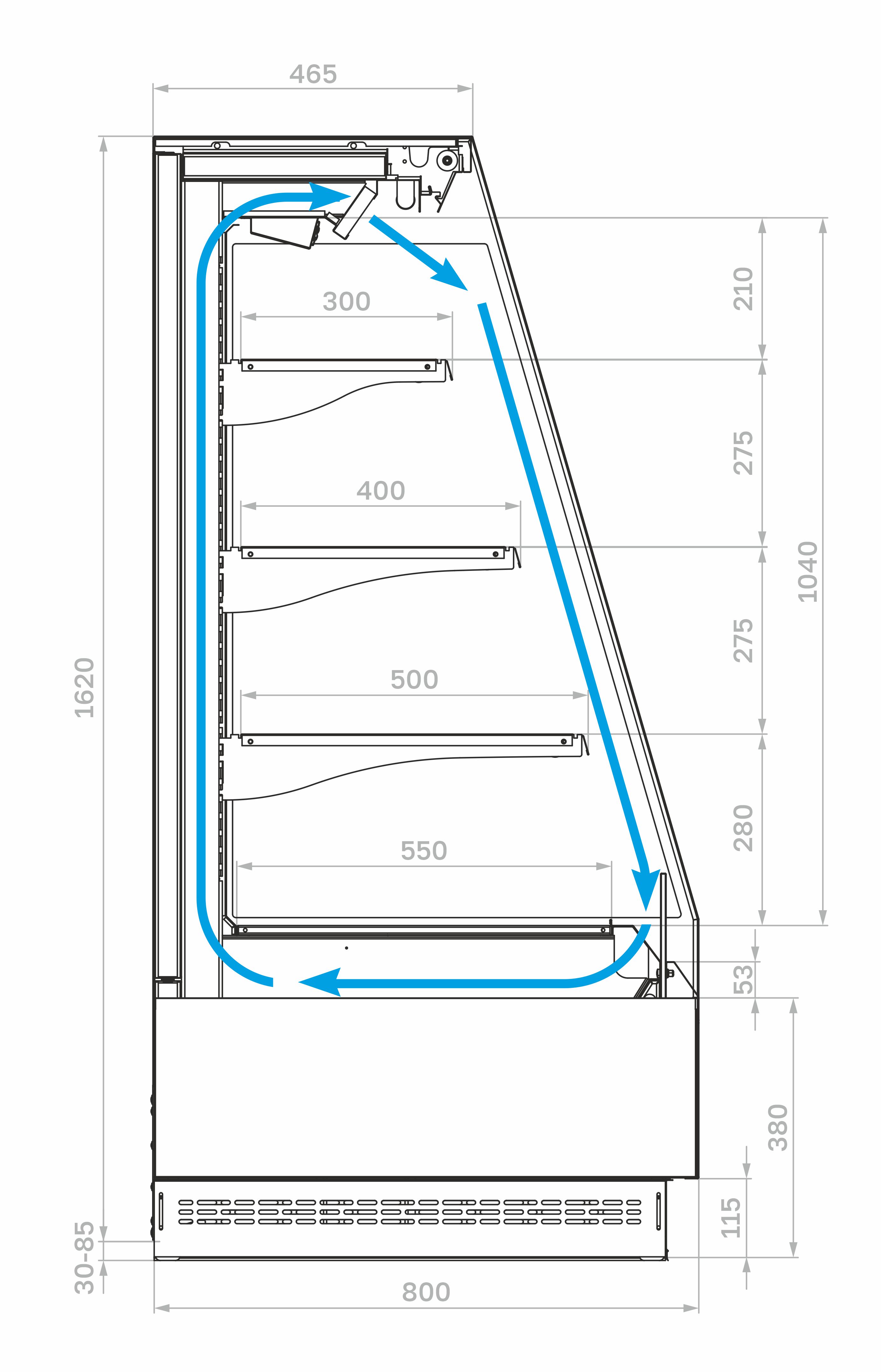 Корпус с наклонным фронтом изготовлен из стали с антикоррозийным покрытием: внешние панели, полки и кронштейны выполнены в сером цвете (RAL 9006), а цоколь и интерьер — в черном цвете (RAL 9005). В качестве теплоизоляции используется пенополиуретан.