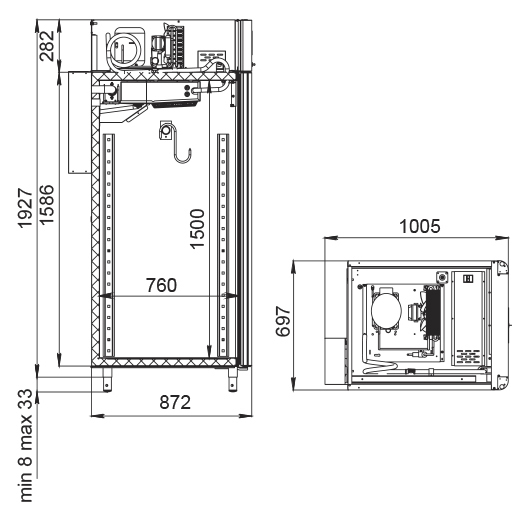 Каталог оборудования Холодильное оборудованиеШкафы холодильныеСпециализированные холодильные шкафыШкаф холодильный для вызревания мяса Polair CS107 Meat черный, со стеклом (Тип 2) Шкаф холодильный для вызревания мяса Polair CS107 Meat черный, со стеклом (Тип 2) Код товара: 062-633 Поделиться: WhatsAppTelegram СравнитьДобавить в КПВ избранное 0 392 700 ₽ В корзину 0 шт Под заказСамовывоз сегодня бесплатно Взять в кредит Купить в лизинг Получить консультацию в WhatsApp Описание Характеристики Отзывы 0 Инструкции 5 Шкаф холодильный для вызревания мяса Polair CS107 Meat черный, со стеклом (Тип 2) предназначен для создания оптимальных условий хранения и дозревания мяса на предприятиях общественного питания и торговли. Монолитный цельнозаливной корпус выполнен снаружи и на двери из окрашенной стали, внутри — из нержавеющей стали, дверь оснащена стеклопакетом. Оборудование рассчитано на работу при температуре окружающей среды до 40 °С. Особенности: Верхнее расположение агрегата для эффективного распределения холода Многофункциональная русифицированная панель управления с дисплеем диагональю 5" Возможность создания и сохранения собственных программ в памяти электронного блока Четыре перфорированные полки для удобного размещения продукции Встроенный ультразвуковой увлажнитель (требуется подключение к системе очищенной воды и централизованной канализации) UV-лампа для обеззараживания воздуха, обеспечивающая санитарную безопасность Распашная дверь с заливной теплоизоляцией и сменным уплотнителем с магнитной вставкой Встроенная удобная ручка Отключаемая внутренняя LED-подсветка Штампованное углубление в дне корпуса для удобства уборки Педаль для бесконтактного открывания двери Максимальная нагрузка на полку — 40 кг Толщина стенок корпуса — 43 мм Polair CS107 Meat черный, со стеклом (Тип 2) — это надежный и функциональный холодильный шкаф, который обеспечивает стабильные и комфортные условия для хранения и дозревания мяса. Высококачественные материалы корпуса и дверей, продвинутые системы увлажнения и обеззараживания воздуха, а также удобное управление позволяют значительно повысить качество продукции и эффективность работы предприятий пищевой отрасли.Изображение товара, представленного на фото, может отличаться от его фактического вида. Показать все Габаритные размеры697×1005×1960 ммДиапазон рабочей температурыот -2 до +30 °CДлина697 ммШирина1005 ммВысота1960 ммОбъём700 лКол-во дверей1 Тип двериСтеклянная Количество полок4 штДопустимая нагрузка на полку40 кгУровень влажностиот 60 до 95 %Холодильный агрегатВстроенный Тип оттайкиАвтоматическая Тип охлажденияДинамическое ПодсветкаЕсть UV-лампаЕсть ХладагентR290 Вес нетто160 кгВес брутто190 кгБрендPolairВсе специализированные холодильные шкафы Из нержавейкиВсе специализированные холодильные шкафы Стеклянная дверь Оставить отзыв Еще никто не оставил отзыв на этот товар Схема POLAIR CS107-Meat.jpgИнструкция на POLAIR CS107-Meat.pdfБрошюра на POLAIR CS107-Meat.pdfДекларация о соответствии.pdfСертификат соответствия.pdf Похожие товары Перейти в каталог Под заказ 399 500 ₽ Шкаф холодильный для вызревания мяса Polair CS107 Meat со стеклом (Тип 1) Под заказ 389 300 ₽ Шкаф холодильный для вызревания сыра Polair CS107 Cheese черный, со стеклом Под заказ 282 471 ₽ Шкаф холодильный для вызревания мяса и сыра Carboma M700GN-1-G-MHC 0430 Под заказ 392 700 ₽ Шкаф холодильный для вызревания мяса Polair CS107 Meat че