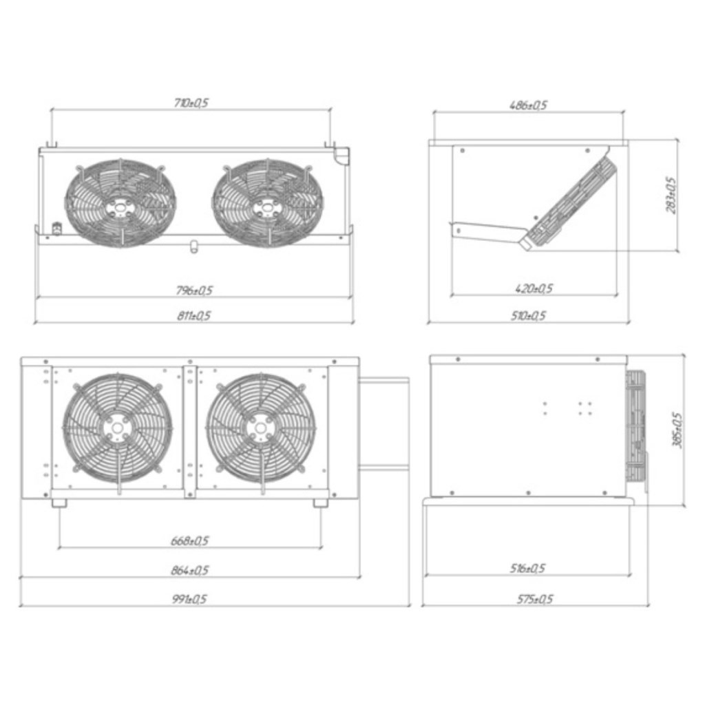 • Воздухоохладитель: два вентилятора Ø 250 мм, шаг ребер — 4,2 мм, дальность струи — до 7 м, расход воздуха — 1200 м³/ч