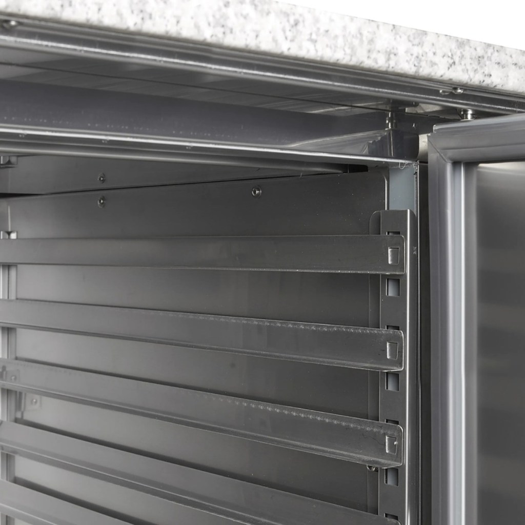 Корпус и внутренняя обшивка выполнены из нержавеющей стали AISI 304, а рабочая поверхность — из гранита, что обеспечивает долговечность, удобство и простоту в уходе.